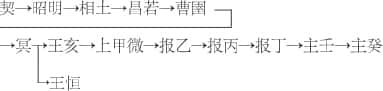 商代自汤开始,至纣灭亡,共传十七世,三十一王,商王世系,据《史记·殷本纪》载,结合甲骨文考察,除去个别有误,基本可信。在成汤以前,从契至成汤,凡传十四世。《国语·周语》说:“玄王勤商,十有四世而兴”,即所谓商族的“先公”时期。这在《史记·殷本纪》和甲骨文中也有记载。商族先公世系是: