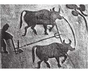 汉代兼用马耕和牛耕,但主要靠用牛。从考古所获西汉牛犁模型、牛耕壁画和犁铧实物等看来,西汉普遍使用所谓二牛抬杠的犁耕法。《汉书·食货志》中所说的二牛三人的耦犁,也是二牛抬杠。由于扶犁人使用牛辔穿牛鼻导引耕牛,省去了牵牛的人力,出现了二牛一人的犁耕法,这是犁耕法的重大进步。西汉末年,又出现了一牛一人的犁耕法,可能是用于熟地的耕作。武帝以后,随着大规模徙民边陲,进行屯田,牛耕技术传到西北。为了保护耕畜,秦汉法律都规定,偷盗马和牛,要加重惩罚。犁耕技术传播的同时,播种用的耧犁也开始使用,西汉晚期,耧犁已传到辽阳一带,辽阳的汉末村落遗址和北京清河汉代遗址中,都发现铁制耧足。
