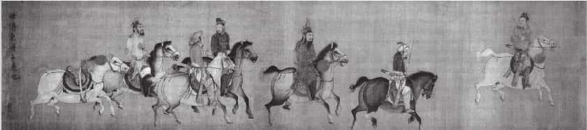 《东丹王出行图》李赞华绘。李赞华(899~936),本名耶律倍,小字图欲,契丹人,辽太祖耶律阿保机长子。曾被册封为东丹王,统领渤海国旧地。长兴二年(931)投奔后唐,被赐姓李,更名赞华。