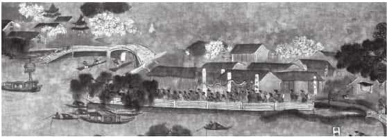 《南都繁会图》(局部)明仇英绘。此图描绘了明万历年间南京城商业繁盛的情景。